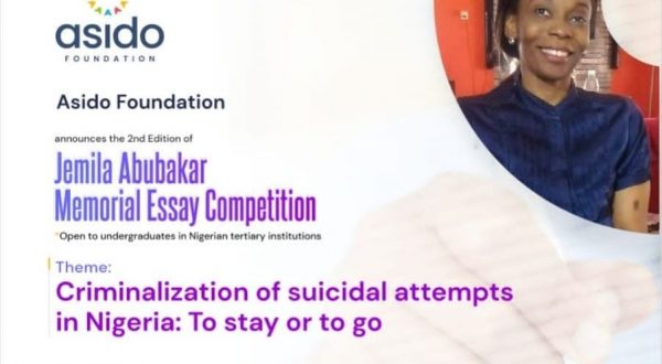 The Asido Foundation has opened entries into the Jemila Abubakar Memorial Essay (JAME) Competition 2021/2022. Intending participants—who must be undergraduate students of tertiary institutions in Nigeria –are invited to submit essays on the topic: Criminalization of Suicide Attempts In Nigeria: To Stay or To Go.