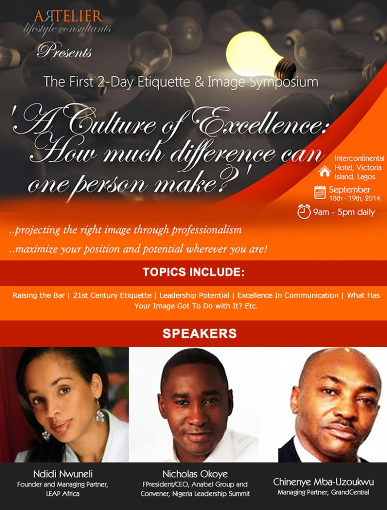 The Artelier Lifestyle Consultants 2014 Seminar themed “A Culture of Excellence: How Much Difference Can One Person Make?” will take place on the 18th and 19th September, at the Intercontinental Hotel, Victoria Island, Lagos. Artelier Lifestyle Consultants is a cutting