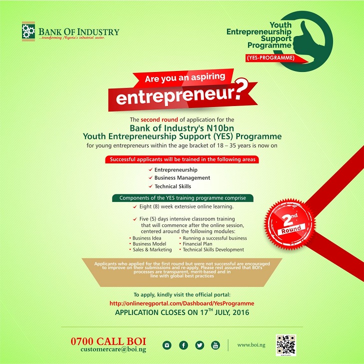 The Youth Entrepreneurship Support Programme (YES-Programme) organised by the Bank of Industry is now open for young aspiring entrepreneurs between the ages of 18 to 35. In a bid to address youth unemployment in Nigeria, the BOI has developed the