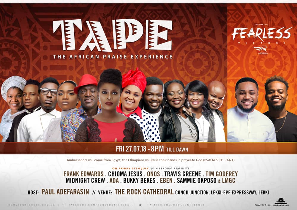 TAPE – The African Praise Experience 2018/ Fearless Concert House on the Rock is set to hold The African Praise Experience alongside the Fearless concert 2018 this evening. TAPE will feature Frank Edwards, Eben, Sammy Okposo, Chioma Jesus, Midnight Crew,