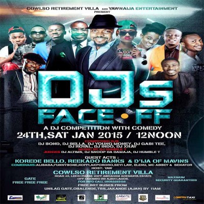 Wazobia FM OAP, YAW, in conjunction with Cowlso Retirement Villa has brought together A-list performers including Alibaba, Korede Bello, Akpororo and others to thrill guests at DJ FACE OFF on Saturday, January 24th 2015. The event, which is packed