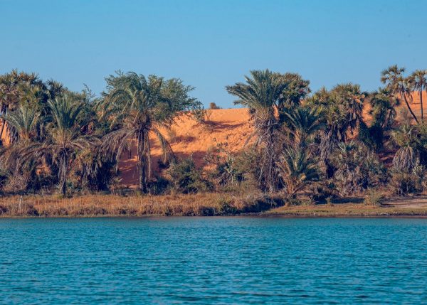 The oasis and the Tulo Tulowa village are in a low valley. The name Tulo Tulo means marshy land with abundant water. The clear water in the pond is constant throughout the year. Surrounding the pond is luxurious green vegetation with palm trees pitched against the warm hues of the desert sand dunes. The sand dunes form five hills around the oasis, giving it an undulating topography. Its beauty shines because of the vastness of the desert area.