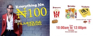 Filmhouse is offering everyone, yes, everyone an opportunity to experience cinema entertainment by introducing what it calls Everything Na N100. Every day between 10 am and 12 noon everything at most Filmhouse cinemas including Apapa is priced N100.