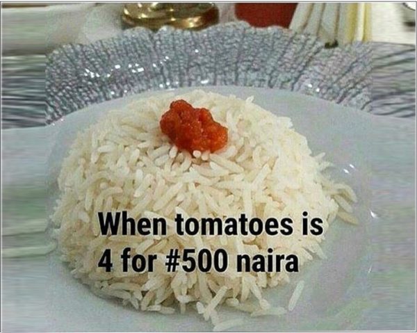 Tomatoes, tomatoes, tomatoes… how many times did I call you? What have Nigerians done to you…? Eh…? That you have decided to do this kind of shakara for us… It’s not fair o… Please we beg you whatever we do eh, please forgive us and visit us again… Our rice misses you plenty plenty.