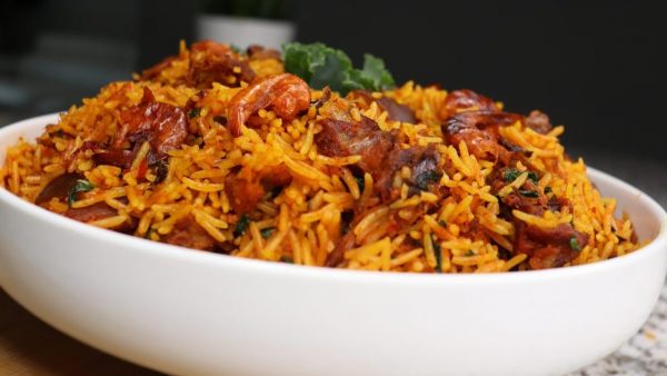 Get a pot large enough to accommodate the rice you’re cooking. Heat the palm oil. Please do not bleach. Add the diced onion and sauté until almost translucent. Add the blended crayfish and locust bean to the pot. Stir fry for about two minutes. Add water to the pot. Please note that the quantity of water you’ll add to the pot should be determined by how soft your parboiled rice is. It’s always advisable to start with small water. The quantity can be increased later if need be.
