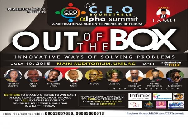 Stimulus production and entertainment in conjunction with Unilag 103.1 FM will host her event, CEO Roundtable α-Summit 2015 on the 10th July, 2015 from 9:00 a.m at the Main Auditorium of the University of Lagos, Yaba with the theme, Out of the BOX: Innovative Ways of Solving Problems.