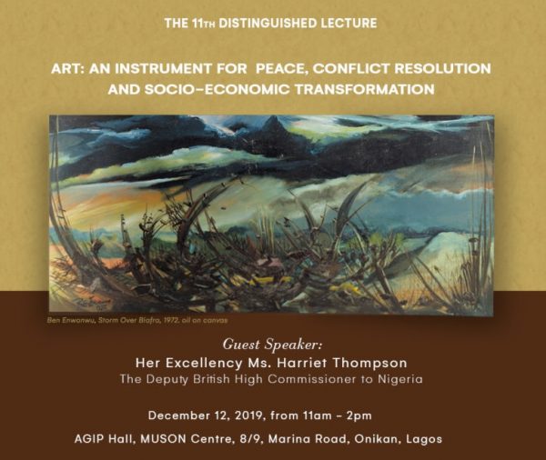 The British Deputy High Commissioner, Ms. Harriet Thompson, and a number of other important personalities gathered at the MUSON Centre on Thursday, 12th December to commemorate Ben Enwonwu’s legacy and contribution to African and Nigerian art. Ms. Thompson gave this year’s lecture on the subject of art as an instrument for peace, conflict resolution and socio-economic transformation, citing Picasso’s use of Guernica as a case study. Picasso expressed an outcry for peace in his Guernica (1937) painting. Guernica was a large scale painting he created after the German bombing of Guernica, a town in Spain. Today, the Guernica painting is one of the most powerful political images in modern art. Similarly, Ben Enwonwu used works like ‘Children of Biafra’ (1968-72) and ‘Storm over Biafra’ (1972) to comment on the terrors of the Nigerian civil war.