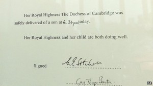 A document delivered to the palace said,”Her Royal Highness, the Duchess of Cambridge was safely delivered of a son at 4.24pm today, Her Royal Highness and her child are both doing well.”