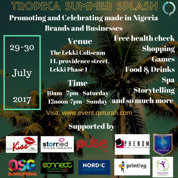 The Tropika Summer Splash is one of a series of pop up (offline marketplace) events that exists for quality Nigerian made lifestyle brands (fashion, beauty, home décor, food, entertainment and games) and businesses to engage with the community, showcase their products, and make sales which serves as a revenue stream for their respective businesses. Expect nothing but the best locally made products at mouth watery deals. Come shop a variety of Men, Women, and children fashion, hair and beauty products, food & drinks, Spas and, games, short storrytelling session, and a silent auction to raise finance for the continuity of the Makoko Dream Project. What’s more, Dennis Ashley Wellness Center will be present to give free health checks on blood pressure measurements, BMI, waist circumference, and blood glucose for high risk individuals.