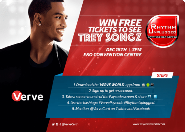Verve Card is offering one lucky person the chance to win a free ticket to Pepsi’s Rhythm Unplugged concert this Friday, at the Eko Hotel and Suites, Victoria Island, Lagos. The highly anticipated event is set to feature live performances from American music artiste, Trey Songz.